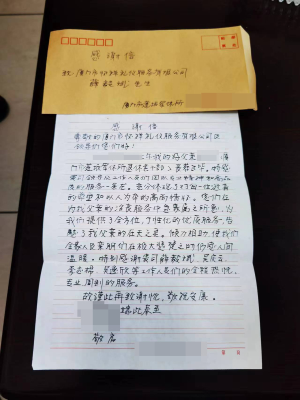 “您們?cè)跒槲腋赣H的治喪服務(wù)中急家屬之所急,為我們提供了全方位,個(gè)性化的優(yōu)質(zhì)服務(wù)..使我們?nèi)胰思坝H朋們?cè)跇O大悲楚之時(shí)仍感人間溫暖...”這是近日廈門(mén)市蓮坂軍休所的軍隊(duì)離休干部林堂(化名)的兒子林先生寫(xiě)給福壽園(廈門(mén))懷祥禮儀服務(wù)有限公司的一封感謝信的節(jié)選。